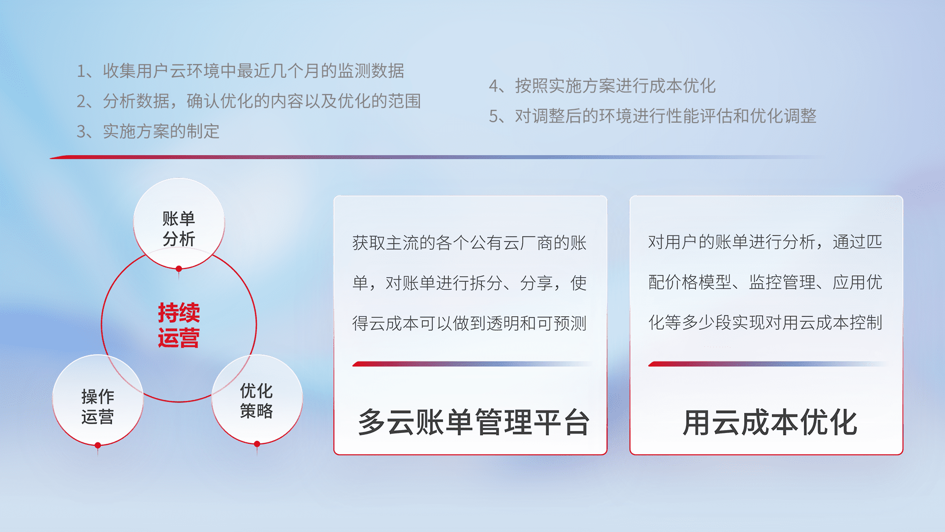 通过多云纳管,,以统一的资源数据模型把客户的云资源进行抽象和封装,,,进而实现对多云资源的统一操作,,,,保障云资源管理的可靠性、、、、稳定性与可用性。。。量身定制化运维内容,,配置、、、开发运维、、、、补丁管理、、、备份、、、监控、、、、认证和访问管理、、审计和日常巡检等,,,保障在用云过程中的可靠度,,稳定度以及高可用率。。